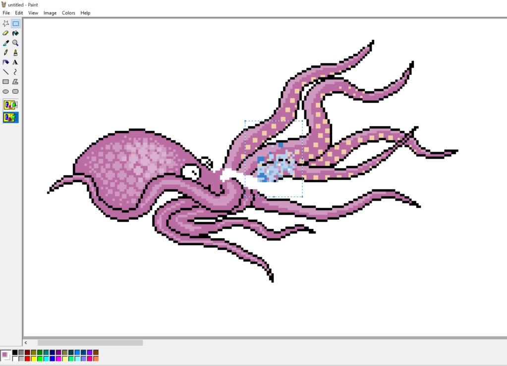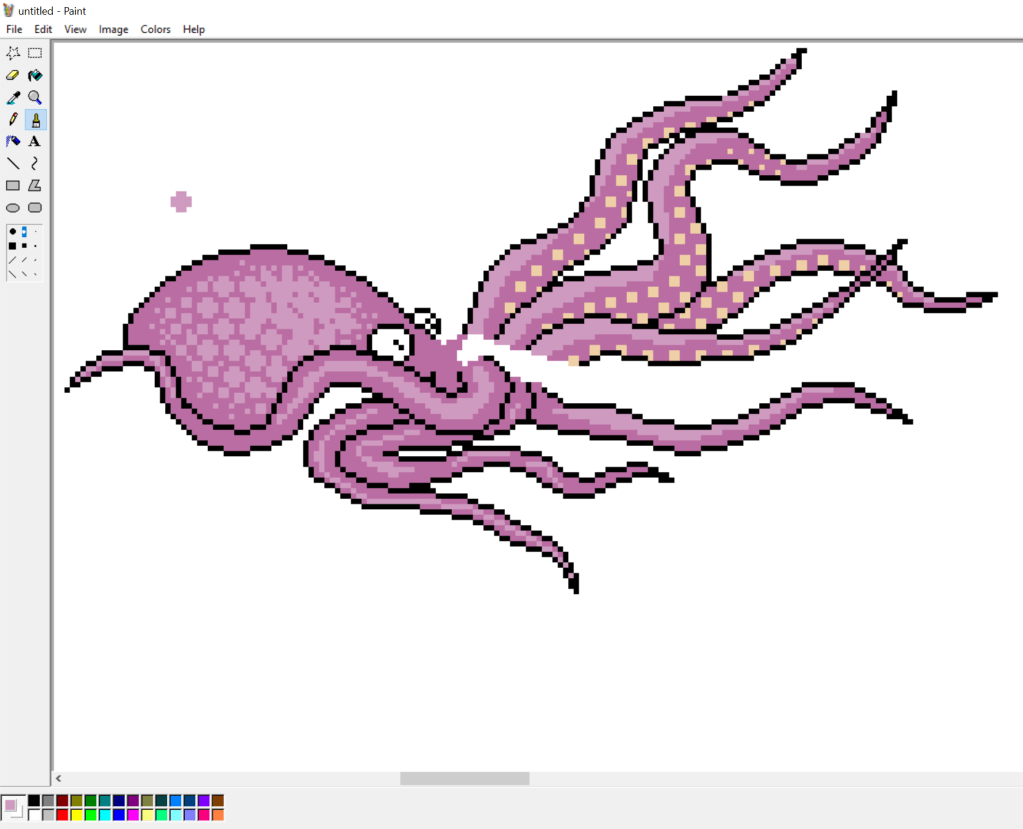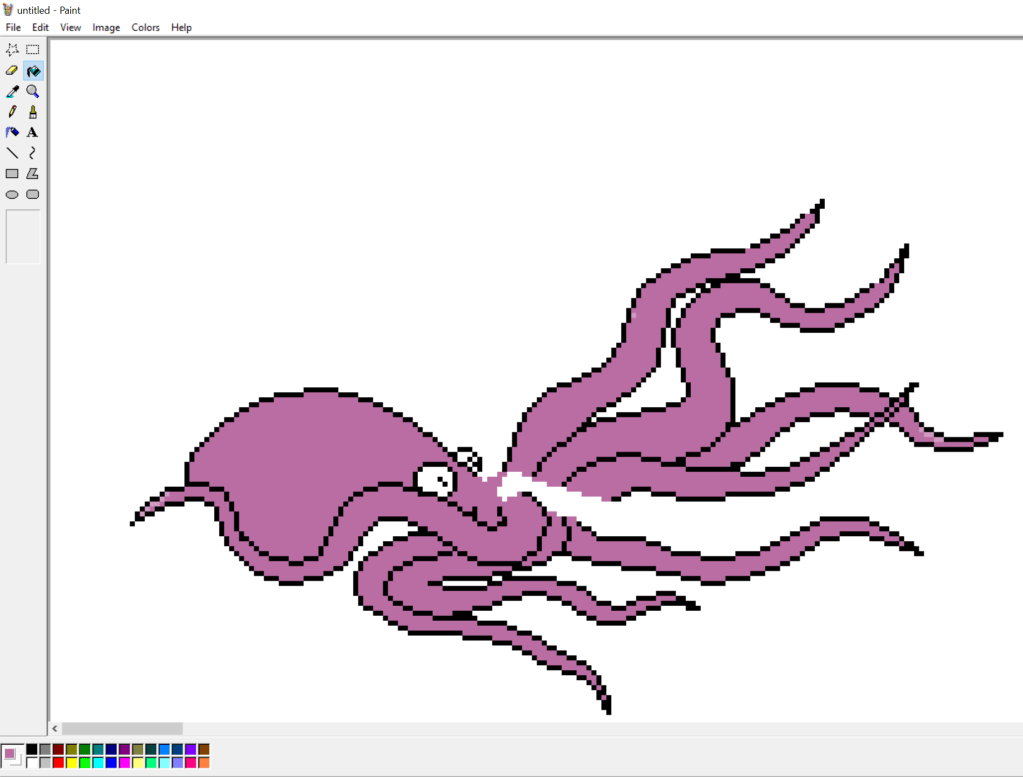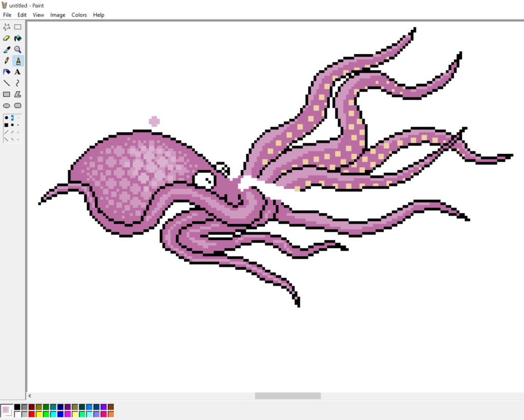 To mimic the idea of suckers on the tentacles, I used the free paint tool and used the 2×2 pixel brush and followed the darker contours of the upper tentacles. I felt that the lower tentacles didn’t need them and that it gave the creature a more mouthy-grabby aura.